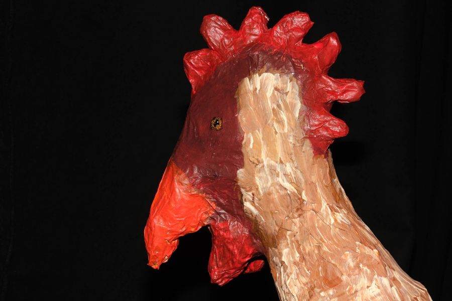 Wechsle nun in den kleinen Übergangsraum. Es ist dieselbe Nacht. Was gibt es hier zu sehen? Ein bunter Hahn und eine Person, die zusammengekauert, in sich gekehrt auf dem Boden sitzt. Höre, was es mit Mensch und Tier auf sich hat.