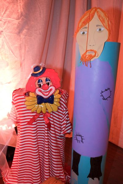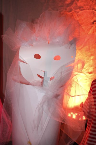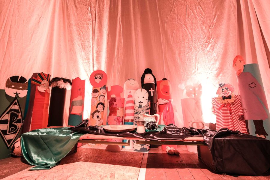 Hier ist die Station des Abendmahls dargestellt. Alles ist sehr bunt. Jesus und seine Freunde sind schon da. Jesus – als einer von uns – ist nicht besonders dargestellt, er ist einer von vielen. Und die Menschen, die dort sitzen, sind ganz unterschiedlich. Nehmt an der gedeckten Tafel Platz und denkt nach über das Teilen von Brot und Wein.